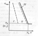 О способности материала работать в условиях циклического нагружения судят по результатам испытаний образцов на усталость (ГОСТ 25.502-79). Их проводят на специальных машинах, создающих в образцах многократное нагружение (растяжение-сжатие, изгиб, кручение). Образцы (не менее 15 шт.) испытывают последовательно на разных уровнях напряжений, определяя число циклов до разрушения. Результаты испытаний изображают в виде кривой усталости, которая в логарифмических координатах: максимальное напряжение цикла σmax (или σa) - число циклов нагружений n cостоит из участков прямых линий (рис.5). Горизонтальный участок определяет напряжение, которое не вызывает усталостного разрушения после неограниченно большого или заданного (базового Nσ) числа циклов. Это