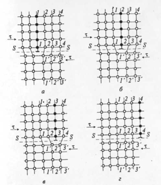 На рис.9 изображена принципиальная схема передвижения одной из многочисленных дислокаций к границе зерна под действием сдвигового напряжения τ. Экстраплоскость 1-1, содержащая дислокацию, под действием напряжения оттесняет противолежащую полуплоскость 2-2 в промежуточное положение и таким образом превращает ее в новую экстраплоскость. При этом полуплоскость 1,-1, становится продолжением бывшей экстраплоскости 1-1 (рис. 9, а, б).