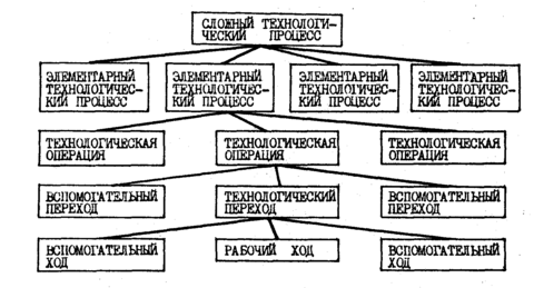 Сложный технологический процесс состоит из: элементарных технологических процессов, технологических операций, технологических и вспомогательных переходов, рабочих и вспомогательных ходов.