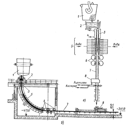 а – вертикальная разливка; б – радиальная разливка; 1 – ковш; 2 – разливочное устройство; 3 – водоохлаждаемый кристаллизатор; 4 – вода для охлаждения; 5 – зона вторичного охлаждения; 6 – тянущие валки; 7 – слиток; 8 – газорез