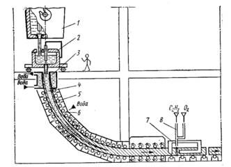 1 – ковш, 2 – промежуточное разливочное устройство, 3 – кристаллизатор (изложница без дна), 4 – затвердевающий слиток, 5– тянущие валики, 6 – зона вторичного охлаждения, 7 – зона резки, 8 – газовый резак