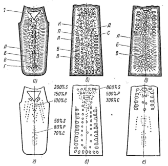 Химическая неоднородность (ликвация) бывает двух видов: дендритная – неоднородность стали в пределах одного кристалла (дендрита); зональная – неоднородность состава стали в различных частях слитка. Из-за конвекции жидкого металла содержание S, P, С в верхней части слитка увеличивается в несколько раз, а в нижней части – уменьшается. Поэтому прибыльную и под прибыльную части слитка, а также донную его часть при прокатке отрезают (прибыль 14 – 22 %, донная часть 1 – 3 % от массы слитка).