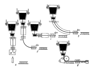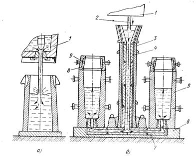 Сталь разливают в изложницы сверху (рис. 2,а), снизу (сифоном) (рис. 2, б) и на машинах непрерывного литья заготовок (МНЛЗ) (рис. 3, 4, 5, 6)