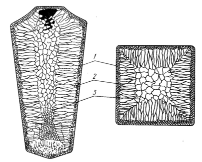 Слитки металла можно различить три зоны с различной структурой (рис. 1). Кристаллизация жидкого металла начинается у поверхности более холодной формы и происходит в тонком сильно переохлажденном слое, примыкающем к поверхности. Вследствие большой скорости охлаждения произойдет образование на поверхности слитка очень узкой зоны 1 сравнительно мелких равноосных кристаллов.