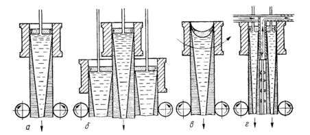 Рисунок 6. Схема непрерывного литья заготовок прямоугольного и круглого сечения (а), биметаллических (б), круглых на МНЛЗ центробежного типа (в) и трубных (г)