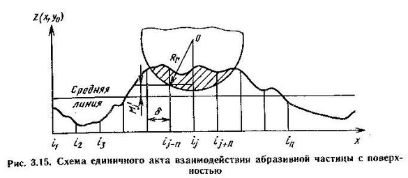 Каждый еденичный акт контактного взаимодействия вызывает определенные изменения о обрабатываемой поверхности. Происходит деформация выступов профиля, удаление материала из лунки, в окрестности точки контакта формируется новый микрорельеф поверхности, изменяется положение средней линии профиля. на рис. 3.15 показана схема единичного контакта взаимодействия абразивной частицы с обрабатываемой поверхностью. В случайной точке j частица достигает максимальной глубины внедрения. Высота профиля микрорельефа относительно средней линии в точках, где произошла деформация, определяется по следующей формуле: