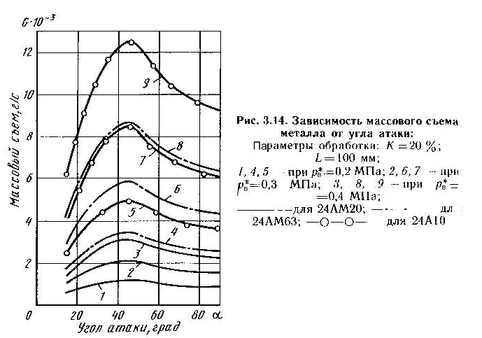 Зависимость массового съема металла от угла атаки носит переменный характер (см. рис. 3.14). С увеличением α от 15 до 45º съем металла возрастает, достигая максимума при а = 45", затем наблюдается снижение съема, а в диапазоне 75—90 º массовый съем изменяется не более, чем на 5...7 %. Такая зависимость сохраняется при работе с абразивными материалами разной зернистости. При увеличении угла атаки от 40 до 50° съем металла изменяется на 5...10% (при ра — 0,4 МПа). Уменьшение размеров абразивных частиц и давления воздуха на входе и активное сопло приводит к некоторому расширению зоны максимального съема (до 35-55°), что имеет существенное значение при обработке криволинейных поверхностей.