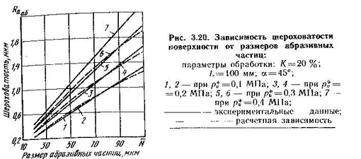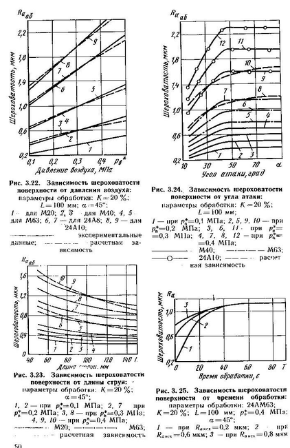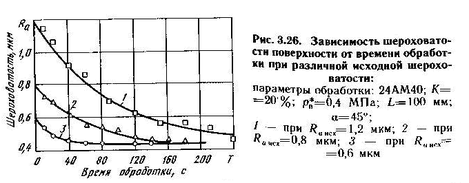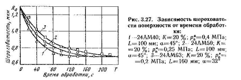 Одна и та же шероховатость поверхности может быть получена при различных сочетаниях технологических параметров. Например, обработка абразивным материалом зернистости М40 при pв*=0,4 МПа, а=45° дает значение Ra=0,68...0,7 мкм, такая же шероховатость получается при зернистости М50, рв*=0,25 МПа, а=45° и М63, рв*=0,2 МПа, а=32°. Время обработки для каждого из трех случаев различно (рис. 3.27). Мини-