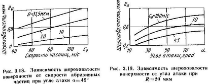 На рис. 3.20, 3-22...3.24 штриховыми линиями показаны графики, подученные в результате математического моделирования процесса формирования микрорельефа обрабатываемой поверхности. Теоретические и экспериментальные зависимости хорошо согласуются между собой, разброс значений не превышает 17...22 %, что является вполне удовлетворительным для такого сложного процесса обработки.