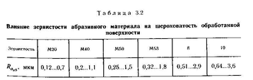 Исследования показали, что зависимость шероховатости обработанной поверхности от размеров абразивных частиц является линейной (рис. 3.20). С увеличением зернистости абразивного материала высота микронеровностей резко возрастает, так как увеличиваются размеры лунок, оставляемых на обрабатываемой поверхности абразивными частицами. Подтверждением этому служат профилограммы поверхностей, обработанных абразивными материалами различной зернистости (рис. 3.21). Для каждого размера абразивных частиц существует максимально достижимое (при данных условиях обработки) значение шероховатости поверхности. Значения шероховатости поверхности, которые могут быть получены в результате обработки абразивными мате риалами различной зернистости, приведены в табл. 3.2.