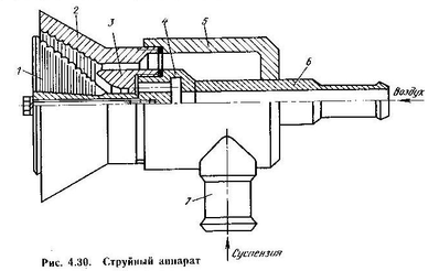 Струйный аппарат, конструкция которого представлена на рис. 4.30, позволяет повысить производительность обработки. Аппарат имеет конус 1, корпус 2, активное сопло 3, кольцо 4, стакан 5, воздухопровод 6 и штуцер дли подвода суспензии 7. Корпус 2 полого цилиндра, переходящего в расширяющийся внутренний конус, соединяется