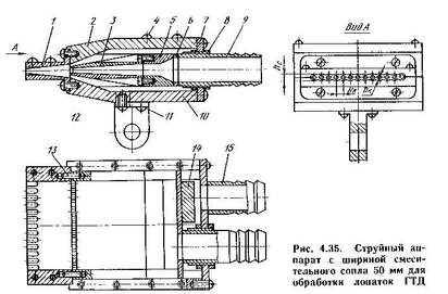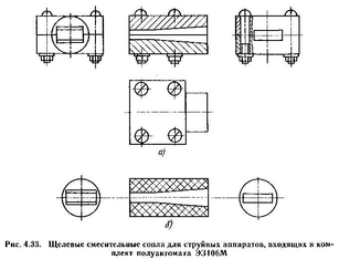 На рис. 4.32 показан струйный аппарат, который формирует струю с равномерным по ширине профилем скорости за счет перекрытия расположенных в ряд с определенным шагом струй круглого сечения. Аппарат используется для обработки сложнопрофильных поверхностей, причем его конструкция позволяет в широких пределах регулировать