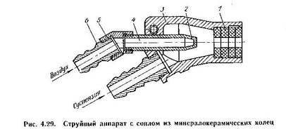 На рис. 4.29 представлена конструкция струйного аппарата с соплом из минералокерамических колец. В корпусе 3 установлено активное сопло 2, в которое через штуцер 6 и муфту 5 подводится сжатый воздух. Подвод суспензии к аппарату осуществляется через штуцер 4. Смесительное сопло выполнено в виде сменных минералокерамических колец 1, стойкость которых к абразивному износу лежит в пределах 90... 100 часов работы.