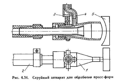 На рис. 4.34 приведена конструкция струйного аппарата со щелевым соплом, предназначенного для обработки фасонных поверхностей (пресс-форм) . Аппарат работает следующим образом. Гидроабразивная суспензия через пульпопровод 2 поступает в корпус 1, который заканчивается насадкой прямоугольного сечения. Сюда же через трубопровод 4 поступает сжатый воздух. Смешиваясь с воздухом, суспензия разгоняется в камере смешивания и с большой скоростью выходит из щели под заданным углом, который регулируется с помощью подвески 3, на обрабатываемую деталь 5.