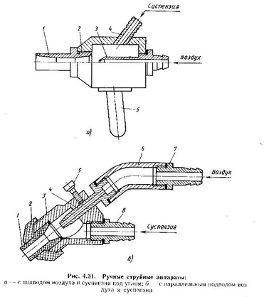 На рис. 4.31 представлены конструкции типичных ручных струйных аппаратов. В корпусе 2 (рис. 4.31, а) закреплены штуцер 4 для подвода суспензии и активное сопло 3 для подачи сжатого воздуха. Смесительное сопло 1 ввинчивается в корпус по резьбе. Тем самым обеспечивается быстрая замена изнашиваемого сопла. К корпусу прикреплена ручка 5, необходимая для эксплуатации струйного аппарата.