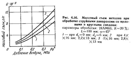 Было отмечено, что при прочих равных условиях (отношение площадей сечений, расходов и давлений подачи воздуха и суспензии и т. д.) струйные аппараты со щелевыми соплами обеспечивают более высокую производительность обработки, чем аппараты с круглыми соплами. Иллюстрацией этому служат графики на рис. 4.36.