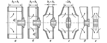 - на рис. 2г, применяется для колес большой подачи и находит применение, в частности, для дутьевых вентиляторов и дымососов ТЭС.