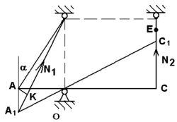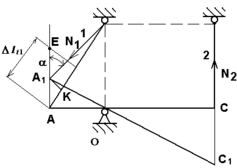 Составляем расчетную схему. С учетом удлинения стержня 2 точка А должна совпасть с точкой Е, если бы не было стержня 1. Сопротивление первого стержня приводит к тому, что точка А занимает положение А1. В связи с этим, в стержнях появляются внутренние усилия N1 и N2. Составим уравнение статики: