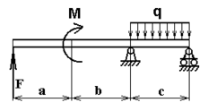 Дана двух опорная балка с приложенными к ней нагрузками М= -15кНм; F=-20 кН; q = 12 кН/м. Допускаемое напряжение [] = 160 МПа. размеры балки a = 0,8 м; b = 0,7 м; c = 0,5 м.
