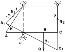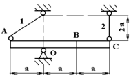 Составляем расчетную схему. Под действием силы Q стержни 1 и 2 будет растягиваться. Вследствие этого появятся внутренние силы N1 и N2. Составим уравнение моментов относительно точки О: