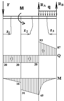 Запишем уравнения поперечных сил и изгибающих моментов для каждого участка балки.
