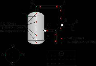 При контроле сплошности металла аппаратов, емкостей, резервуаров УКПГ и ДКС 100 % - ному сплошному контролю подвергается днище и часть примыкающей к нему обечайки сепараторов, часть обечаек сепараторов, контактирующих с газожидкостной и газовой средой. Вибрационные измерения выполняются в контрольных точках, обозначенных на специальных схемах (рис. 1).
