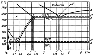 На представленных диаграммах (рис.1) кроме общих линий АС, АЕ, GS остальные линии не совпадают. В системе Fe—C графитная эвтектика (аустенит—графит) содержит 4,26 % С и образуется при 1 153 ° С. По линии E' S' в интервале температур 1 153–738 ° С выделяется вторичный графит. Эвтектоидное превращение протекает при 738 ° С с образованием эвтектоида (феррит + графит). Пользование диаграммами Fe—C и Fe—Fe3C принципиально не отличается друг от друга.