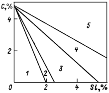 Рис. 2. Структурная диаграмма: 1 — белые чугуны; 2 — половинчатые чугуны; 3, 4, 5 — серые чугуны на перлитной, феррито-перлитной и ферритной основе соответственно