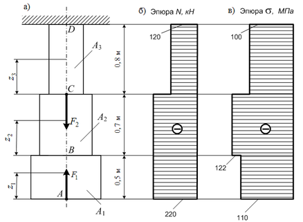 Для ступенчатого стального бруса требуется: а) определить значения продольной силы и нормального напряжения по длине бруса; б) построить эпюры