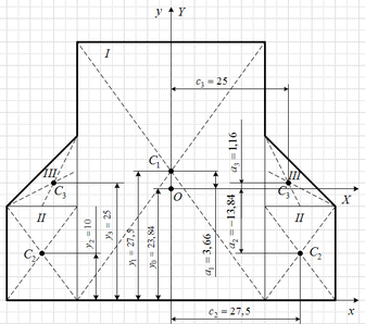совпадает с ее вертикальной осью симметрии. Относительно выбранных осей координат определим положение лишь вертикальной координаты центра тяжести фигуры. Для этого разбиваем сечение на три прямоугольника I, II и два треугольника III (рис.3).