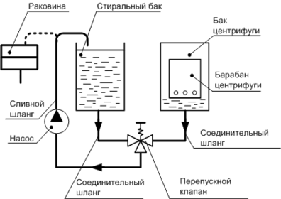 Если в машине один насос, то он работает от электродвигателя привода центрифуги. Моющий раствор откачивается через перепускной клапан или проходной кран. Гидросистему с одним насосом и перепускным клапаном (рис.2) имеют стиральные машины АУРИКА-70 и СИБПРЬ-5М. Перепускной клапан связан со стиральным баком и баком и баком центрифуги соединительными шлангами. Выход перепускного клапана связан с входным штуцером насоса, выходной, штуцер которого соединен со сливным шлангом. Конструкция перепускного клапана такова, что при неработающем насосе клапан препятствует поступлению жидкости из стирального бака в бак центрифуги. В то же время моющий раствор из стирального бака свободно поступает в сливной шланг. Поэтому при стирке белья свободный конец сливного шланга должен быть опущен в стиральный бак (сплошная линия на рис. 2). При работающем насосе жидкость из бака центрифуги перекачивается в стиральный бак, усиливая циркуляцию моющего раствора. Для слива моющего раствора свободный конец сливного шланга переносят в раковину (пунктирная линия на рис.2).