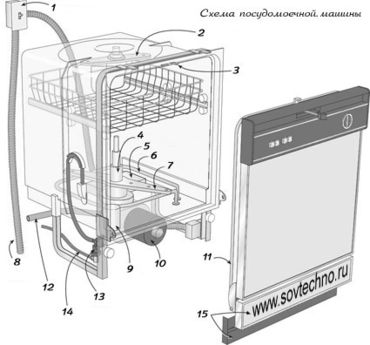 1-Выключатель;2-Верхний распылитель; 3-Замок; 4-Крышка распылителя; 5-Крышка насоса; 6-Нагревательный элемент; 7-Распылитель; 8-Провод электросети; 9-Поплавковый переключатель; 10-Мотор; 11-Резиновый уплотнитель двери; 12-Сливной шланг; 13-Наливной клапан; 14-Наливной шланг; 15-Декоративная панель.