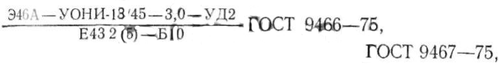 Підрозділ електродів по типах виконаний в ГОСТ 9467-75, 10051-75 і 10052-75. По ГОСТ 9467-75 передбачено 9 типів електродів для зварки вуглецевих і низьколегованих сталей (Е38, Е42, Е42А, Е46, Е46А, 350, Е50А, Е55 і Е60), 5 типів електродів для зварки легованих сталей підвищеної і високої міцності (Е70, Е85, Е100, Е125 і Е150) і 9 типів електродів для зварки легованих теплостійких сталей (Е-09М, Е-09МХ, Е-09Х1М, Е-05Х2М, Е-09Х2М1, Е-09Х1МФ, Е-10Х1М1НФБ, Е-10Х3М1БФ, Е-10Х5МФ). Позначають електроди для зварки вуглецевих і легованих сталей по ГОСТ 9466-75. Наприклад, електроди типу Е46А по ГОСТ 9467-75 марки УОНІ-13/45 діаметром 3,0 мм для зварки вуглецевих і низьколегованих сталей позначаються так: