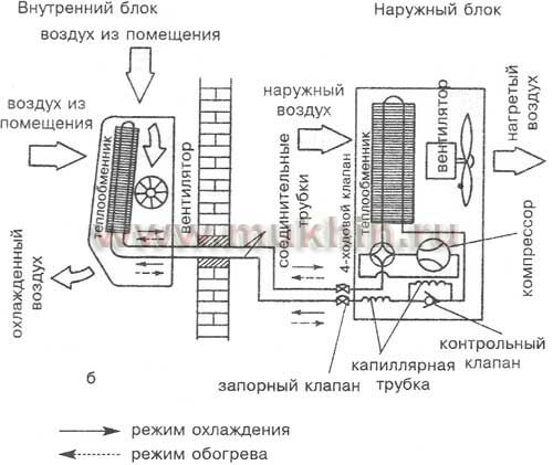 Принцип работы. Компрессор, конденсатор, дроссель (капиллярная трубка, ТРВ и др.) и испаритель соединены тонкостенными медными трубками (в последнее время иногда и алюминиевыми) и образуют холодильный контур, внутри которого циркулирует хладагент. (Традиционно в кондиционерах используется смесь фреона с небольшим количеством компрессорного масла, однако в соответствии с международными соглашениями производство и использование старых сортов, разрушающих озоновый слой, постепенно прекращается).