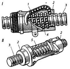 Для полного устранения зазоров в шариковой паре «винт — гайка» на винте устанавливают одновременно две шариковые гайки 2 (рис. 3, II), между которыми помещают стальную пружину 5. Пружина, создавая предварительный натяг между винтом 3, шариками и гайками, устраняет все зазоры в передаче.
