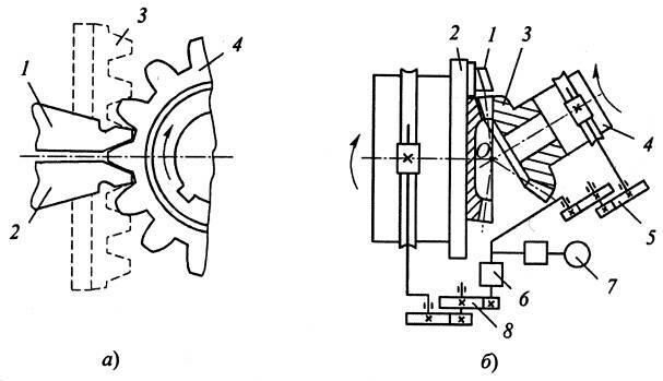 Строгание каждого зуба колеса производится двумя резцами на станках-полуавтоматах моделей 5С276П, 5А26 и др., а также фирмы "Глисон" (США) по схеме, представленной на рис.4, а. Здесь резцы 1 и 2, установленные в суппорте на люльке станка, представляют собой впадину зуба воображаемого производящего колеса 3, с которым в процессе зубонарезания находится в зацеплении обрабатываемое колесо 4.