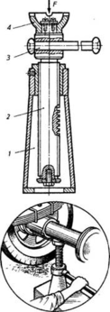 Винтовой домкрат состоит из ходового силового винта 2 (рис. 2), ввинчиваемого в корпус 1, и рукоятки 3 с собачкой , преобразующих качательное движение, получаемое рукояткой от руки рабочего, в прерывистое вращение. Винт домкрата несет на себе грузовую головку 4, которая может иметь различное конструктивное оформление.