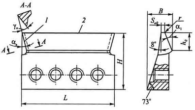 ГОСТ 5392-80 устанавливает четыре типа таких резцов, отличающихся размерами (H, L и др.) в зависимости от диапазона модулей нарезаемых колес. Например, резцы типа I предназначены для нарезания колес модулем m = 0,3...3,25 мм, а типа IV - для нарезания колес модулем m = 13...20 мм. Профиль режущих кромок черновых резцов не регламентируется и может быть ступенчатым или криволинейным, обеспечивающим равномерный припуск под чистовую обработку. Зажимная часть зубострогального резца выполнена в виде клина с углом 73°, что обеспечивает его плотное прилегание к плоскостям державки. Резец крепится в державке винтами, число которых (2...5) зависит от его типоразмера. Передняя грань резцов плоская, заточенная у стандартных резцов под углом в нормальном сечении γ n = 20°. В зависимости от свойств обрабатываемых материалов резцы затачивают также и под другими углами ( γ n = 10….25°). Задний угол на вершинной кромке в статическом положении резца α B = 0°. В рабочем положении за счет поворота резца относительно дна впадины нарезаемого колеса задний угол при вершине α B = 12° (рис. 6). На боковой режущей кромке задний угол α б < α В.