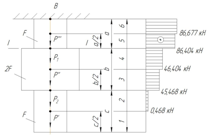 Σz = 0; -N4 + Р’ + P2 + P’’= 0; N4 = Р’+ P2 + P’’= 0,468 +45 + 0,936 = 46,404 кН.