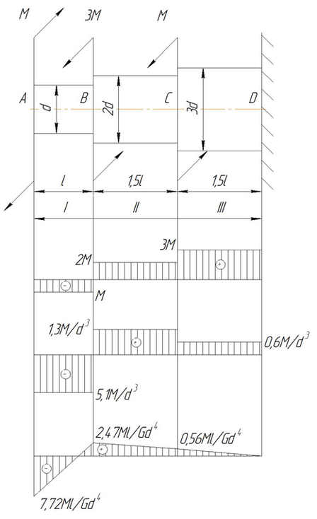 Заданный вал имеет три участка нагружения (рис. 3). Возьмем произвольное сечение в пределах участка 1 и отбрасываем правую часть бруса. На оставленную часть бруса действуют моменты М и МzI. Следовательно: