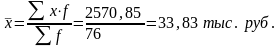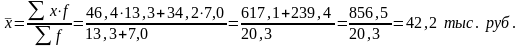 Средний показатель среднемесячного душевого дохода населения определяется как отношение общего валового дохода населения к численности населения. Неизвестным является числитель – валовой доход населения, которой представляет собой произведение среднемесячного душевого дохода населения на численность населения, таким образом, численность населения выступает частотой, следовательно, применяем формулу средней арифметической взвешенной.