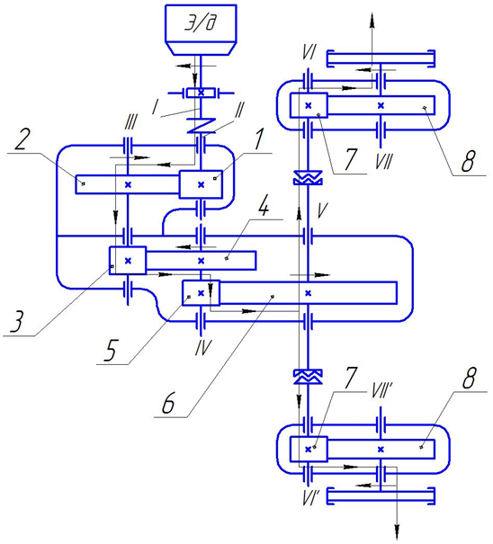 | Пара-метр | Z1, Z2 | m1-2, мм | Z3, Z4 | m3-4, мм | Z5, Z6 | m5,6, мм | Z7, Z8 | m7,8, мм | Pдв, кВт | n, мин-1 |