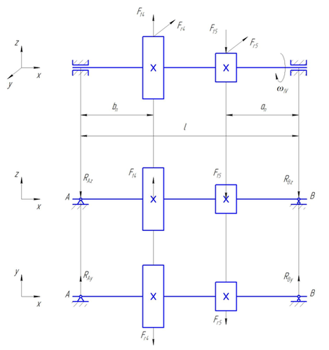 Покажем на схеме направление сил действующих на колесо и шестерню зубчатой цилиндрической передачи, и направление реакций в опорах промежуточного вала от действия этих сил (рис. 5).