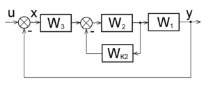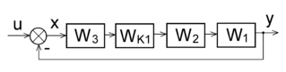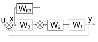 В даному випадку коригувальний пристрій є зворотним зв’язком, як правило від’ємним, якій охоплює один з елементів прямого ланцюга системи. Звичайно цей елемент є або виконавчим елементом, або вихідним каскадом підсилювача (підсилювач потужності). Його передаточну функцію позначимо