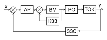 У системі задіяні такі блоки: АР – автоматичний регулятор; ВМ – виконавчий механізм; РО – регулюючий орган; ТОК – технологічний об’єкт керування; КЗЗ – коригувальний зворотній зв’язок; ЗЗС – зворотній зв’язок системи.