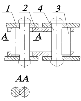 При работе цепных передач в условиях, вызывающих возрастание трения в шарнирах (запыленные и химически активные среды) используют открытошарнирные пластинчатые цепи. Будучи открытым, шарнир такой цепи самоочищается от попадающих в него абразивных частиц. Наружные звенья такой цепи не отличаются от аналогичных звеньев роликовой цепи. Внутренние звенья образуются из пластин 2, имеющих отверстия в форме восьмерки, и фасонных валиков 3, заменяющих втулку. Валик 4 свободно проходит через отверстие в пластине 2 и взаимодействует с фасонным валиком 3. Замена тонкостенных втулки и ролика не только удешевляет цепь, но и резко повышает сопротивление усталости деталей цепи. Благодаря этому открытошарнирные цепи оказались значительно долговечнее роликовых при работе в тяжелонагруженных передачах.