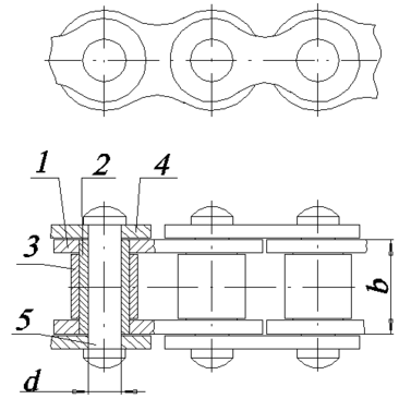 Наиболее широко применяют роликовые цепи , которые образуются из последовательно чередующихся внутренних и наружных звеньев. Внутренние звенья состоят из внутренних пластин 1 и запрессованных в их отверстия гладких втулок 2, на которых свободно вращаются ролики 3. Наружные звенья состоят из наружных пластин 4 и запрессованных в их отверстия валиков 5. Концы валиков после сборки расклепывают. Благодаря натягу в соединениях наружных пластин с валиками и внутренних пластин со втулками и зазору между валиком и втулкой образуется шарнирное соединение. Для повышения сопротивления усталости значения натягов принимают значительно бόльшими, чем предусмотрено стандартными посадками. Пластическое деформирование пластин в зоне отверстий, неизбежное при столь больших натягах, существенно повышает сопротивление усталости пластин (в 1,6…1,7 раза). Многорядные цепи с числом рядов от двух до восьмисобирают из деталей с такими же размерами, что и однорядные, кроме валиков имеющих соответственно большую длину. Нагрузочная способность цепей почти прямо пропорциональна числу рядов, что позволяет в передачах с многорядными цепями уменьшить шаг , радиальные габариты звездочек и динамические нагрузки.