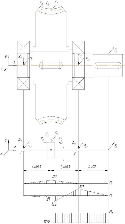 Rx1 = (Ft2 · l2 – Fб2 · (d2 / 2) – Fм · lм) / l = (10079· 66,5 – 2540 · 126 – 4455 · 72) / 133 = 355 Н
