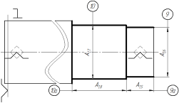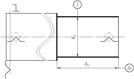 | Операция 1. Токарная. А. Установить заготовку в центра. База: Ось и правый центр. 1. Точить (черновое) поверхность 7 в размер А1,1, выдерживая размер А1,2. |