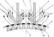 Из-за загромождающего действия ребер каркаса 9 он выполнен так, чтобы обеспечивалась меньшая скорость обратного тока фильтрата 11 по сравнению со скоростью тангенциально ориентированного (направленного по касательной) к промываемому участку потока 1. Тангенциальная скорость такова, что происходит отрыв потока 1 от внутренних стенок канала 4 с образованием двух каверн 3 и 5. Заметим, что входное отверстие 6 канала 4 выполнено в виде щели с длиной вдоль всей протяженности фильтрующей поверхности 8 (вдоль ребер каркаса). Очевидно, что такую же протяженность имеют и указанные каверны.